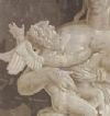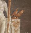 Meraviglioso papier peint dipinto a tempera magra su carta, applicato su tela, con cornice in legno intagliato, dipinto a tempera magra e pastiglia dorata. Il papier peint rappresenta Venere come se fosse una statua seduta su un trono marmoreo. Sul trono, spicca l'iscrizione “Venus”. Con una mano, la dea tiene in collo il figlio Cupido, caratterizzato dalle ali, mentre con l'altra solleva una torciera, animata da una fiamma rossa. Tra i delicati dettagli dell'opera, si possono osservare una coppia di uccelli intenti a dissetarsi da un “kantharos” e i fregi del trono, adornati con motivi animali e floreali. Venere è ritratta in tutta la sua maestosità e regalità, con il seno scoperto e avvolta in pochi lembi di chitone. Le figure si stagliano in un elegante sfondo grigio antracite, conferendo all'opera un'atmosfera quasi simbolica. La rappresentazione è caratterizzata da una grande maestria artistica, rendendola incredibilmente raffinata. Si ascrive ad artista anonimo francese del periodo neoclassico, intorno alla seconda metà del XVIII secolo.
