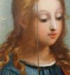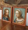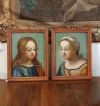 Elegante coppia di dipinti ad olio su tavola lignea, che raffigura Gesù e la Madonna in una giovanile fisionomia. Originariamente parte di una più ampia pala lignea, queste due opere si presentano oggi come preziosi frammenti. Sia Gesù che la Madonna sono adornati da aureole e indossano tuniche e vesti ricche di colori, i cui dettagli sono resi con una finezza straordinaria. I loro sguardi, rivolti verso il basso, emanano un candore e una serenità che colpiscono. La tecnica pittorica utilizzata richiama i grandi maestri del XV e XVI secolo, come Raffaello, evidenziando l'abilità dell'artista. Le cornici, in legno intagliato e rifinite a bolo, completano le opere con un tocco di eleganza, pur senza doratura. I dipinti si ascrivono ad un pittore dell’area toscana, attivo intorno alla fine del XVI secolo.