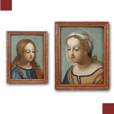 Elegante coppia di dipinti ad olio su tavola lignea, che raffigura Gesù e la Madonna in una giovanile fisionomia. Originariamente parte di una più ampia pala lignea, queste due opere si presentano oggi come preziosi frammenti. Sia Gesù che la Madonna sono adornati da aureole e indossano tuniche e vesti ricche di colori, i cui dettagli sono resi con una finezza straordinaria. I loro sguardi, rivolti verso il basso, emanano un candore e una serenità che colpiscono. La tecnica pittorica utilizzata richiama i grandi maestri del XV e XVI secolo, come Raffaello, evidenziando l'abilità dell'artista. Le cornici, in legno intagliato e rifinite a bolo, completano le opere con un tocco di eleganza, pur senza doratura. I dipinti si ascrivono ad un pittore dell’area toscana, attivo intorno alla fine del XVI secolo.