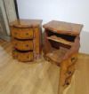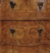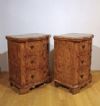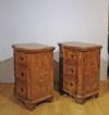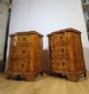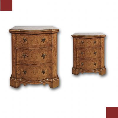 Raffinata coppia di comodini finemente lastronati in legno massello e radica di noce, impreziositi da intarsi a filetti. I comodini presentano un basamento a mensola tipico del periodo e una forma mossa sul fronte, caratteristica particolare per l’epoca. La coppia comprende: uno con tre cassetti, collocato dal lato della donna, e l’altro con uno sportello, generalmente collocato al lato dell’uomo; entrambi sono apribili tramite maniglie in bronzo fuso a cera persa. Si tratta di una coppia di comodini di grande gusto e raffinatezza, in grado di donare un tocco di classe e di antichità a qualsiasi ambiente. Manifattura veneta (nord-Italia), del periodo Luigi XIV, intorno alla prima metà del XVIII secolo.