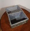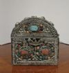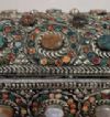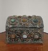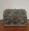 Raffinato ed unico bauletto portagioie in legno intagliato, rivestito da una lastronatura in metallo sbalzato a mano e argentato. L’oggetto presenta cerniere ribattute e interni laccati a tempera magra nei toni del blu. All’esterno, il bauletto è decorato con pietre dure di vari tipi e colori, incastonate per creare motivi geometrici che ne esaltano la raffinatezza. Si tratta di un oggetto di grande gusto e classe, capace di aggiungere un tocco di eleganza e antichità a qualsiasi ambiente. Manifattura mediterranea del XIX secolo.