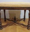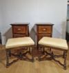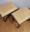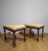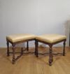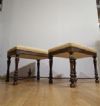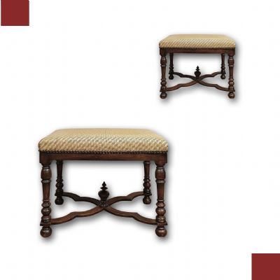 Raffinata coppia di sgabelli in legno massello di noce, finemente intagliati e torniti. Questa coppia di sgabelli si caratterizza per le quattro gambe elegantemente tornite, con traverse incrociate al centro da cui si diparte una piccola anfora. La seduta, comoda e rivestita da tessuto ambrato e giallo con motivi geometrici, conferisce ulteriore raffinatezza. Si tratta di una coppia di sgabelli di grande gusto ed eleganza, in grado di aggiungere un tocco di classe e di antichità a qualsiasi ambiente. Manifattura toscana del periodo Luigi XIV, intorno alla seconda metà del XVII secolo.