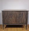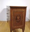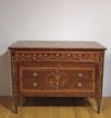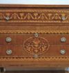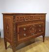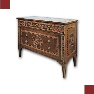 Suntuoso cassettone lastronato in legno di noce, impreziosito da intarsi in legno di frutto e pastiglia, tecnica tipica della scuola ebanista lombarda. Il cassettone presenta gambe troncopiramidali, caratteristiche del periodo, e una forma lineare ed elegante. Dispone di tre cassetti, di cui uno più piccolo posizionato sotto il piano, e due cassetti più grandi e ergonomici ideali per riporre oggetti, aperti mediante tiranti in bronzo. La grande raffinatezza di questo cassettone risiede nella sua decorazione ad intarsio, molto ricca e dettagliata, che si estende sul fronte, sulle gambe, sui lati e sul piano, presentando motivi geometrici e fitomorfi. Si tratta di un mobile di grande gusto e qualità, in grado di arredare con classe e raffinatezza qualsiasi ambiente. Manifattura lombarda (Lombardia, Italia), probabilmente ascrivibile alla scuola dell’ebanista Giuseppe Maggiolini, del periodo neoclassico, intorno alla fine del XVIII secolo.
