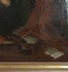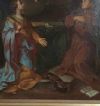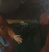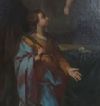 Raffinato dipinto ad olio su tela, impreziosito da una cornice in legno intagliato e dorato. Nel dipinto è raffigurata una scena di adorazione, con il bambino Gesù posizionato in alto, in posizione centrale, seminudo e seduto su delle nuvole. Gesù tiene una sfera blu in una mano, simbolo del dominio di Dio sul mondo, mentre con l’altra mano punta l’indice verso il cielo, ad indicare la sua natura divina. Ai lati della scena, sono rappresentate due coppie di angeli che assistono e partecipano all’evento. In basso, in adorazione e con lo sguardo rivolto verso Gesù, sono dipinti due santi in ginocchio: a sinistra Santa Caterina, che regge un ramo di palma, e a destra Sant’Antonio, raffigurato con la tunica da frate, con le mani incrociate sul petto e una corda legata a un frammento ligneo. Si tratta di un dipinto di grande gusto e raffinatezza, caratterizzato da una raffinata resa stilistica dei dettagli pittorici e da un sapiente uso del chiaroscuro, capace di conferire un tocco di eleganza e di antichità a qualsiasi ambiente. Manifattura ascrivibile alla scuola veneta dei primi del XVIII secolo.