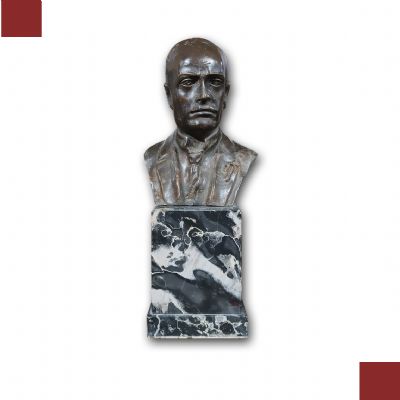 Scultura realizzata in bronzo fuso a cera persa, con base in marmo grigio a venature bianche. La scultura raffigura il busto di Benito Mussolini, montato su una base parallelepipeda. L’uomo è raffigurato a mezzo busto, vestito da statista con giacca, cravatta e spilletta con il fascio littorio. Il volto è invece leggermente voltato di lato. Sul retro sono inoltre graffiti il nome dell’artista cioè Rossi, mentre più in basso è visibile il timbro dell’officina. La scultura si distingue per la sua raffinata tecnica stilistica e l’accurata lavorazione, in grado di conferire un tocco di storia e di presenza significativa a qualsiasi ambiente. Manifattura italiana dei primi anni ’30 del XX secolo.
