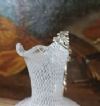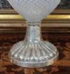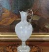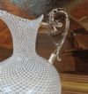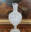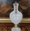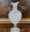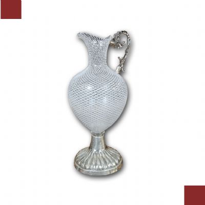 Raffinata brocca caratterizzata da un corpo in vetro, con manico e base in argento. La base presenta un motivo lavorato a baccellature, mentre il manico si distingue per i motivi vegetali. Il corpo della brocca è realizzato in vetro tramite la tecnica detta “a reticello”, con motivi a rete di fili bianchi intrecciati che conferiscono grande raffinatezza all’insieme. La brocca è dotata di un becco svasato, aggiungendo ulteriori elementi di eleganza. Si tratta di un oggetto di grande classe e stile, capace di donare un tocco di gusto antico e decorativo a qualsiasi ambiente. Manifattura veneziana del XVIII secolo.