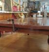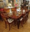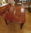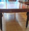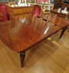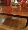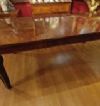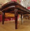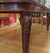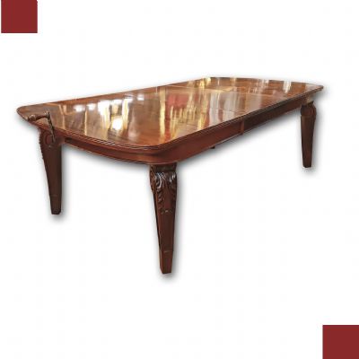 Raffinato tavolo in massello di mogano, finemente intagliato. La sua forma è rettangolare, con bordi stondati e una fascia liscia sul sottopiano. Ad aggiungere ulteriore eleganza vi è la decorazione degli intagli sulle gambe, caratterizzati da motivi geometrici e fitomorfi. Questo tavolo è molto pratico e comodo, in quanto dotato di un meccanismo a manovella posizionato al capotavola che permette di allungarlo e restringerlo facilmente, e che può essere sfilata. È presente una prolunga a giorno e può essere ulteriormente esteso di circa 60cm. Si tratta di un mobile di grande gusto e raffinatezza, in grado di arredare con classe qualsiasi ambiente. Manifattura inglese del periodo Carlo X, intorno alla prima metà del XIX secolo.
