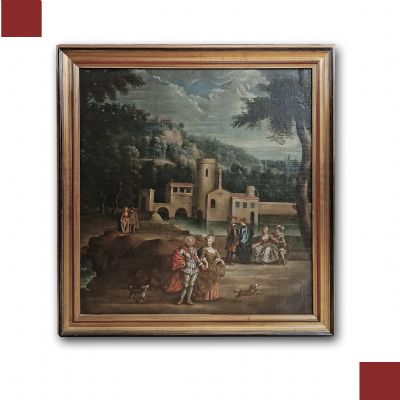 Raffinato dipinto a olio su tela, incorniciato da una cornice di legno intagliato dorato ed ebanizzato. Il dipinto raffigura un paesaggio collinare con un bosco, al cui interno si intravedono architetture e figure. Al centro si trova un mulino, circondato dall’acqua, con alberi e altre figure disposte attorno. In primo piano appaiono due personaggi, uomo e donna, intenti in una passeggiata, vestiti con abiti d’epoca di raffinata fattura, e accanto a loro due cani. Dietro di loro, sulla destra, un gruppo di giovani impegnati in una chiacchierata; sulla sinistra, più in lontananza, si scorgono altre due figure, uomo e donna, anch’essi vestiti con austerità elegante. Nell’opera l’artista padroneggia la tecnica del chiaroscuro e una pittura di stile realistico. Si tratta di un dipinto pregevole, in grado di arredare con gusto e raffinatezza qualsiasi ambiente. Manifattura francese della fine del XVIII secolo.
