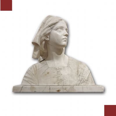 Straordinario busto scolpito in marmo, caratterizzato da venature grigiastre, raffigurante la Pulzella di Orléans, Giovanna d'Arco. L’attribuzione è confermata dall'iscrizione "Jeanne d'Arc" presente sul fronte. La scultura ritrae la giovane Giovanna non in vesti militari, ma in abiti civili, con un umile velo che le copre i capelli e una semplice veste, visibile solo all’inizio del busto, chiusa da lacci. Questo ritratto si distingue per la sua interpretazione, poiché privo di elementi bellici; l’artista ha scelto di esprimere invece la compassione, la paura e la sensibilità della giovane. La straordinaria abilità dell’artista si evidenzia nella resa del volto, in particolare nei lineamenti e negli occhi, che trasmettono un profondo significato. Si attribuisce ad un artista francese anonimo, poiché manca la firma, la cui opera risale alla prima metà del XIX secolo.