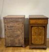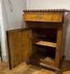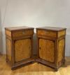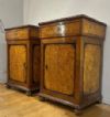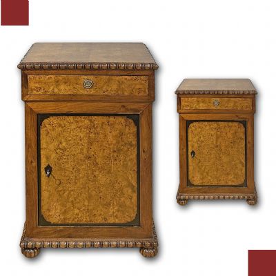 Splendida coppia di piccole credenze realizzata in massello di acero, rivestito con impiallacciatura in radica di tuja e rifinita con dettagli in noce che ne esaltano l'eleganza. La bicromia del legno chiaro, in contrasto con le rifiniture più scure, aggiunge un tocco di raffinatezza, mentre il disegno del legno contribuisce a rendere questi mobili ancora più affascinanti. I credenzini sono caratterizzati da piedi a cipolla e da una decorazione classica con ovuli nel sottopiano e nella parte inferiore, che ne elevano il design. Inoltre, il piano liscio in radica è un elemento distintivo. Le cerniere in bronzo dorato, insieme a uno sportello e a un cassetto ergonomici, offrono praticità per riporre oggetti all'interno. Questa magnifica coppia è in grado di adornare con gusto e classe qualsiasi ambiente. Manifattura mitteleuropea del periodo Carlo X, intorno ai primi del XIX secolo (1820/1830 ca.).