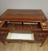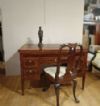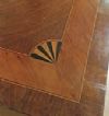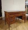 Raffinato scrittoio interamente lastronato in noce e palissandro, impreziosito da radica di noce e intarsi realizzati anche con legni di frutto. Lo scrittoio presenta gambe troncopiramidali, caratteristiche del periodo, e un piano scorrevole verso il retro. In questo modo, il mobile risulta comodo per la seduta, senza essere necessariamente inserita all’interno dello spazio del mobile stesso; aprendolo, si scopre il piano per scrivere, dotato di un leggio rivestito in pelle rossa. Quest’ultimo è anch’esso scorrevole, sia al centro che ai lati, rivelando quattro cassetti segreti ideali per riporre oggetti. Il mobile è inoltre dotato di cinque cassetti sul fronte ed è a giorno, poiché anche sul retro si può ammirare la maestria degli intarsi. Questi ultimi sono di grande raffinatezza, realizzati in motivi geometrici e nella classica forma a ventaglio sugli spigoli, conferendo un’eleganza superiore. Si tratta di un mobile di grande gusto e raffinatezza, capace di aggiungere un tocco di classe e di antichità a qualsiasi ambiente. Manifattura del centro-Italia del periodo Luigi XVI, intorno alla fine del XVIII secolo.