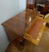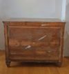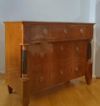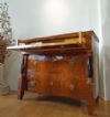Elegante cassettone con scrittoio a calatoia, lastronato in pregiato legno di noce. Il cassettone presenta gambe troncopiramidali, tipiche della fine del XVIII secolo, mentre l’esterno e le colonne riflettono lo stile e il periodo dell’Impero degli inizi del XIX secolo. Il fronte è decorato da due colonne ebanizzate e composto da tre cassetti, dotati di maniglie in bronzo fuso a cera persa. Gli ultimi due cassetti sono ergonomici, ideali per riporre oggetti, mentre il primo cassetto si apre come scrittoio, grazie ad una cerniera che fa calare il piano, e presenta ulteriori piccoli scomparti in legno chiaro e un piano di lavoro rivestito in pelle. Questo bellissimo cassettone è in grado di arredare con raffinatezza ed eleganza qualsiasi ambiente. Manifattura italiana del periodo impero, tra le fine del XVIII e gli inizi del XIX secolo.