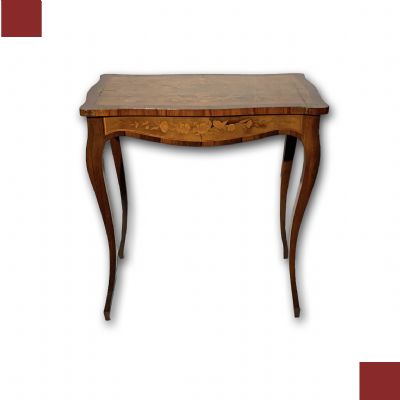 Splendido tavolino da appoggio in legno interamente decorato con fini intarsi di legni pregiati quali noce, olivo e rosa. Gli intarsi riguardano dettagli floreali presenti sul piano e sui lati, che conferiscono un tocco di eleganza e raffinatezza al tavolo. Le gambe leggermente curve richiamano lo stile dei mobili francesi del periodo Napoleone III. Con la sua forma rettangolare, questo tavolino è perfetto per arricchire un salotto o una stanza di ricevimento, aggiungendo un tocco di classe e sofisticatezza. Realizzato con maestria in Italia nella metà del XIX secolo, seguendo lo stile francese.