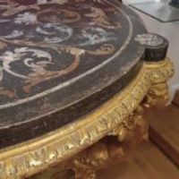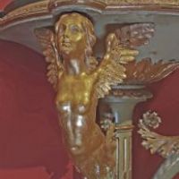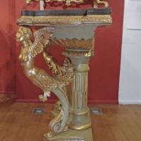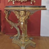 Elegante consolle a mezzaluna leggermente centinata, realizzata in legno intagliato a mano, dorato a foglia d’oro e dipinto. La consolle presenta una base geometrica e un fusto a colonnina, dipinti di colore salvia e impreziositi da dettagli dorati. A decorare ulteriormente la parte inferiore, vi sono due protomi femminili alate e dorate, nude, che emergono da riccioli vegetali alla base, conferendo eleganza, raffinatezza e un tocco di gusto antico. Il piano, anch’esso in legno, è decorato con finti intarsi di marmo a motivi floreali, che arricchiscono ulteriormente il mobile. Si tratta di una consolle elegante da palazzo, in grado di arredare con gusto e raffinatezza qualsiasi ambiente. Manifattura genovese (Genova, Italia) del periodo impero, intorno ai primi del XIX secolo.