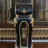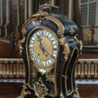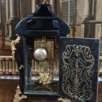 Elegante orologio da tavolo con cassa centinata, realizzata in legno intagliato a mano ed ebanizzato, decorata con dettagli in bronzo fuso a cera persa e dorato. A conferire ulteriore raffinatezza contribuiscono gli intarsi in ottone sul legno, caratterizzati da motivi vegetali e geometrici che richiamano i motivi e le tecniche di costruzione del celebre ebanista francese Boulle del XVIII secolo. Il meccanismo dell’orologio si presenta in perfette condizioni ed è dotato di una suoneria che emette le ore e le mezzore, con carica settimanale. Il quadrante è caratterizzato da numeri romani, mentre la cassa è apribile anche sul fronte, dotata di vetro, e presenta vetri anche sui lati. Il pendolo, in bronzo dorato, raffigura il tipico sole settecentesco. Sul fronte, sotto il quadrante, è visibile la scritta “Henneger Lyon”, riferibile all’ebanista francese di Lione, mentre nel meccanismo sono timbrati i numeri “239” e la dicitura “Bailly Weibel - Lyon”, ascrivibile all’orologiaio francese anch’egli di Lione. Questo orologio è unico, e rappresenta un raffinato elemento di arredamento, capace di impreziosire con gusto qualsiasi ambiente. Manifattura francese della metà del XIX secolo, in stile Luigi XV.