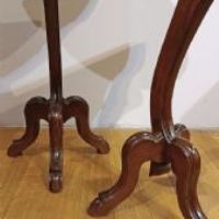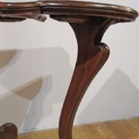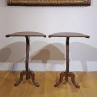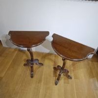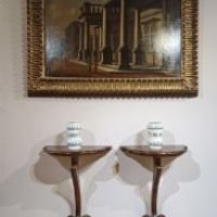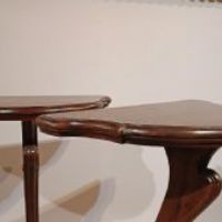 Elegante coppia di piccole consolle guéridon in massello di noce, finemente intagliate a mano. Ciascuna presenta un fusto ricurvo che si apre in tre piedi a ricciolo, che ne accentuano la grazia, e un piano sagomato che dona eleganza. Una coppia unica, di buona fattura, capace di impreziosire con gusto e raffinatezza qualsiasi ambiente. Manifattura veneta (Nord-Italia) in stile Luigi XV, da ascrivere al XIX secolo.