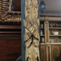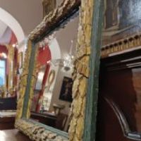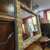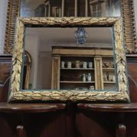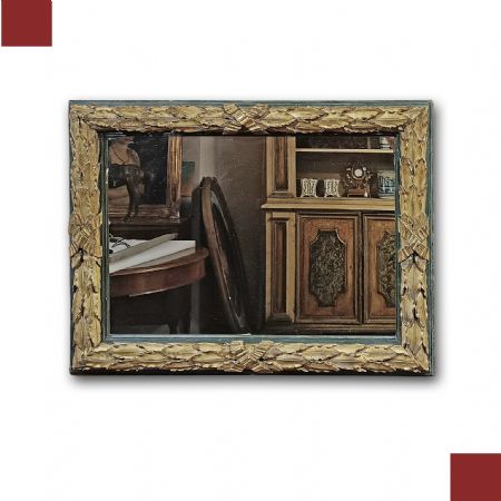 Elegante specchiera in legno di cirmolo intagliato e dorato a foglia d’oro zecchino, dipinta nella tonalità del verde antico. La cornice è decorata da foglie d’alloro sovrapposte e nodi agli angoli, conferendo ulteriore eleganza. Lo specchio è in buone condizioni e originale. Si tratta di una specchiera di grande classe e fascino, capace di arredare con cura e raffinatezza qualsiasi ambiente. Manifattura toscana del periodo neoclassico, databile alla seconda metà del XVIII secolo.