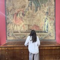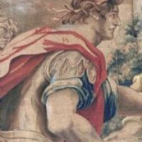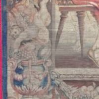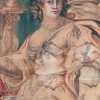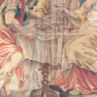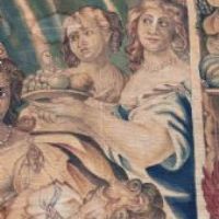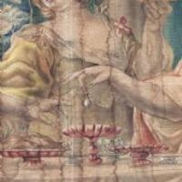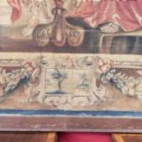 Bellissimo grande dipinto su tela realizzato con colori vegetali. Il dipinto raffigura il banchetto tra Antonio e Cleopatra; come noto da Plutarco, Cleopatra organizzò un sontuoso convivio per impressionare Antonio, al termine del quale sciolse una gemma preziosa nel calice di vino, come visibile nella scena al centro della tela e come riportato dall’iscrizione sulla parte superiore: “Cleopatra gemmam ineffabilis valoris Antonio in potum fundit”, che tradotto è: “Cleopatra mette una gemma di ineffabile valore nella bevanda di Antonio”. Seduti al tavolo imbandito, ai rispettivi lati compaiono Antonio, vestito con la lorica, e Cleopatra, in abiti eleganti e ornata di perle e diadema. Intorno a loro si muovono le donne della corte della regina, che portano vassoi di pietanze e fanno compagnia a Cleopatra, nonché un erote volante. Si tratta di una scena molto diffusa negli arazzi del XVII secolo, replicata da diverse botteghe di Bruxelles: tra queste, uno degli arazzi è conservato oggi all’Hermitage, e proprio da esso trae l’ispirazione questo grande dipinto. Infine, ad ornare la scena vi è una cornice di ghirlande vegetali e di frutta, richiamo dello stile rinascimentale, con piccoli personaggi che la colgono. Si tratta di un’opera unica, di grande valore storico e antico, che consente di arredare con raffinatezza qualsiasi ambiente. Manifattura toscana in stile neo-rinascimentale, della seconda metà del XIX secolo.