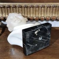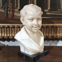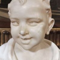 Bellissima scultura in marmo bianco, caratterizzata da poche venature grigie, montata su una base in marmo nero con piccole venature bianche. La scultura raffigura un bambino sorridente, con il volto leggermente girato e a mezzo busto, vestito con dei panni a fascia sul corpo. La particolarità risiede nella rappresentazione del volto, in cui si evidenzia la grande maestria nella resa scultorea dei dettagli, tra cui i riccioli dei capelli, gli occhi e la bocca che si apre in un sorriso. Si tratta di un'opera di grande bellezza e raffinatezza scultorea, capace di donare un tocco di eleganza e di aria antica a qualsiasi ambiente. Manifattura italiana della fine del XIX secolo, in stile neo-rinascimentale.