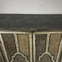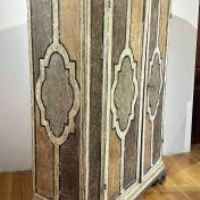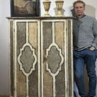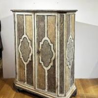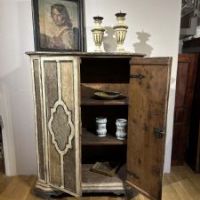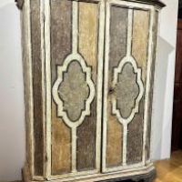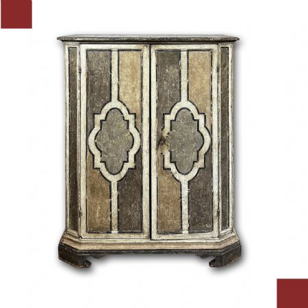 Elegante stipo in legno di abete, finemente intagliato e decorato a tempera magra nei toni del bianco, giallo, marrone, nero e verde. La struttura presenta angoli scantonati, con piedi a mensola che ne esaltano la linea sobria e raffinata. Dotato di due sportelli che si aprono grazie a una chiave in bronzo, al loro interno si dispongono tre ripiani ergonomici ideali per riporre oggetti di vario genere. La decorazione pittorica, accuratamente realizzata sia sul fronte che sui lati, conferisce un tocco di eleganza ulteriore al mobile, richiamando motivi di tarsie geometriche con losanghe centrali. Si tratta di un mobile di grande gusto e raffinatezza, capace di impreziosire con eleganza qualsiasi ambiente. Manifattura marchigiana (centro Italia), del periodo Luigi XIV, intorno alla prima metà del XVIII secolo.