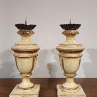 Elegante coppia di candelabri in legno di cirmolo intagliato e laccato color avorio, impreziositi da rifiniture dorate in oro zecchino. I candelabri presentano una pianta quadrata e una forma ad anfora liscia, esaltata da dettagli raffinati. Le decorazioni dorate conferiscono un tocco di classe e di eleganza superiore. Questa coppia di portacandele è versatile, adatta sia per l'uso come candelabri che come porta lampade; è possibile elettrificarli e impiegarli come abat-jour, rendendoli complementi decorativi di grande pregio e funzionalità. Manifattura toscana (centro-Italia) del periodo neoclassico, intorno alla seconda metà del XVIII secolo.