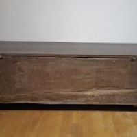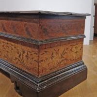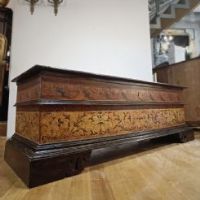 Elegante cassapanca in legno di noce massello, intagliata e dipinta. La cassapanca presenta una forma rettangolare, con piedi a mensola, un piano aggettante e una fascia modanata. Il piano è apribile, rivelando al suo interno un ampio spazio per riporre oggetti. La sua particolarità risiede nei decori pittorici, che ne esaltano l’eleganza, con motivi di intrecci vegetali su sfondo rosso e giallo, dal gusto e richiamo ancora rinascimentale. Si tratta di un mobile, probabilmente utilizzato come guardaroba o cassa nuziale, capace di arredare con raffinatezza e un tocco di antichità qualsiasi ambiente. Manifattura emiliana (Emilia-Romagna, Italia), del periodo Luigi XIV, intorno ai primi del XVII secolo.