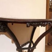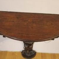 Elegante consolle in noce massello finemente intagliata. La consolle presenta un piano a mezzaluna e tre gambe ferine. È decorata con intagli geometrici, fitomorfi e protomi di leoni agli angoli e al centro, che ne esaltano la raffinatezza. Si tratta di una consolle da muro, dotata di supporti per l'affissione, capace di impreziosire qualsiasi ambiente con un tocco di classe e di antichità. Manifattura toscana del periodo neoclassico, intorno alla seconda metà del XVIII secolo.