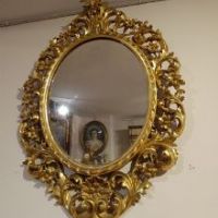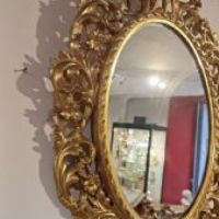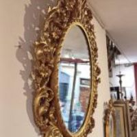 Raffinata specchiera di medie dimensioni e dalla forma ovale, realizzata in legno finemente intagliato e dorato a foglia d’oro zecchino. La cornice d’epoca si distingue per le eleganti volute vegetali che ne impreziosiscono l’aspetto, conferendo grande raffinatezza. Lo specchio, in ottime condizioni, completa questa raffinata opera d’arredo. Si tratta di una specchiera capace di arredare con gusto e raffinatezza qualsiasi ambiente. Manifattura fiorentina ascrivibile al periodo in cui Firenze fu capitale d’Italia, intorno alla seconda metà del XIX secolo (1875 ca.).