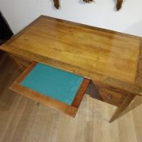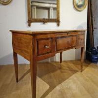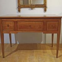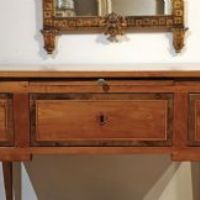 Elegante piccolo scrittoio da centro lastronato in legno di noce, con intarsi in legni di vari frutti. Lo scrittoio si distingue per le gambe troncopiramidali, tipiche del periodo, e presenta intarsi a filetti geometrici sul fronte, sul piano sui lati e sul retro. Il mobile dispone di tre cassetti sul fronte, ideali ed ergonomici per riporre oggetti e apribili con chiavi, mentre sul retro sono riproposti i tre cassetti però finti, consentendo di posizionare lo scrittoio anche al centro della stanza. È inoltre dotato di un piccolo piano estraibile, rivestito in tessuto verde. Si tratta di uno scrittoio di grande gusto ed eleganza, in grado di arredare con classe qualsiasi ambiente. Manifattura toscana del periodo neoclassico, intorno alla seconda metà del XVIII secolo.