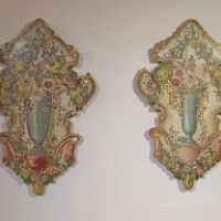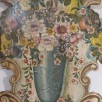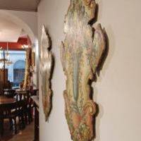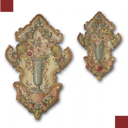 Elegante coppia di pannelli in legno di abete intagliato e centinato, finemente dipinti a tempera magra. Nei due pannelli sono raffigurati al centro due vasi, ornati da fiori e frutti, circondati da una cornice a volute geometriche. I pannelli si trovano in buono stato di conservazione, e le loro pitture sono apprezzabili per la resa stilistica e l’uso dei colori. Questa coppia di pannelli, grazie alla loro eleganza e raffinatezza, è in grado di conferire un tocco di classe e di antichità a qualsiasi ambiente. Manifattura tipica marchigiana (centro-Italia), della metà del XIX secolo.