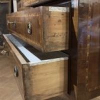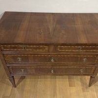 Raffinato cassettone finemente lastronato in piuma di noce, impreziosito da intarsi a filetti geometrici realizzati in piuma di noce e legni di frutto. Il mobile si distingue per le gambe troncopiramidali, tipiche del periodo, e presenta quattro cassetti: due di dimensioni ridotte e due più grandi, ergonomici, ideali per riporre vari oggetti. I cassetti sono decorati con eleganti geometrie di intarsi, che si ripetono anche sui lati del cassettone, e sono dotati di maniglie e serrature in bronzo fuso a cera persa. Si tratta di un cassettone di grande gusto e raffinatezza, capace di arredare con classe ed eleganza qualsiasi ambiente. Manifattura emiliana (Emilia-Romagna, Italia) del periodo neoclassico, intorno alla seconda metà del XVIII secolo.