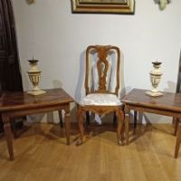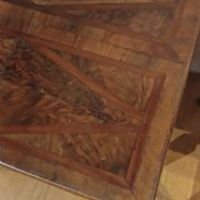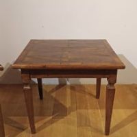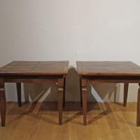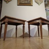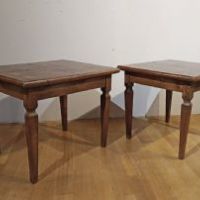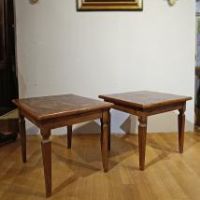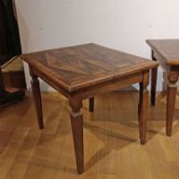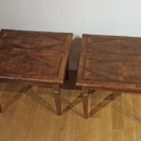 Elegante coppia di tavolini bassi lastronati e intarsiati in legno di noce, ulivo e altre essenze. I tavolini sono caratterizzati da gambe troncopiramidali, tipiche dello stile neoclassico, e da piani impreziositi da intarsi geometrici che ne aumentano l’eleganza. Si tratta di una coppia di tavolini di grande gusto e raffinatezza, capaci di arredare qualsiasi ambiente con un tocco di classe e di antichità. Manifattura toscana del periodo Luigi XVI, intorno alla fine del XVIII secolo.