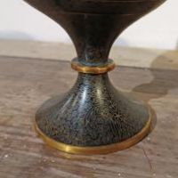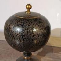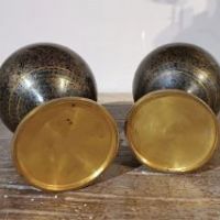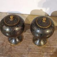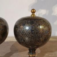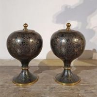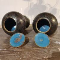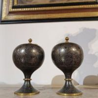 Raffinata coppia di vasi ad urna, lavorati con la tecnica del cloisonné e rifiniture in ottone lucidato. I vasi presentano una rara forma con corpo globulare, piede ad anello, e con tappo in metallo. Di colore grigio antracite, sono decorati con motivi dorati di tipo geometrico e fitomorfo, che conferiscono ulteriore eleganza agli oggetti. Si tratta di una coppia di vasi di grande gusto e antichità, in grado di arredare con un tocco di classe e raffinatezza qualsiasi ambiente. Manifattura cinese della prima metà del XIX secolo.