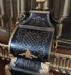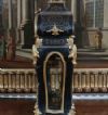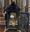 Elegante orologio da tavolo con cassa centinata, realizzata in legno intagliato a mano ed ebanizzato, decorata con dettagli in bronzo fuso a cera persa e dorato. A conferire ulteriore raffinatezza contribuiscono gli intarsi in ottone sul legno, caratterizzati da motivi vegetali e geometrici che richiamano i motivi e le tecniche di costruzione del celebre ebanista francese Boulle del XVIII secolo. Il meccanismo dell’orologio si presenta in perfette condizioni ed è dotato di una suoneria che emette le ore e le mezzore, con carica settimanale. Il quadrante è caratterizzato da numeri romani, mentre la cassa è apribile anche sul fronte, dotata di vetro, e presenta vetri anche sui lati. Il pendolo, in bronzo dorato, raffigura il tipico sole settecentesco. Sul fronte, sotto il quadrante, è visibile la scritta “Henneger Lyon”, riferibile all’ebanista francese di Lione, mentre nel meccanismo sono timbrati i numeri “239” e la dicitura “Bailly Weibel - Lyon”, ascrivibile all’orologiaio francese anch’egli di Lione. Questo orologio è unico, e rappresenta un raffinato elemento di arredamento, capace di impreziosire con gusto qualsiasi ambiente. Manifattura francese della metà del XIX secolo, in stile Luigi XV.