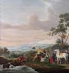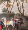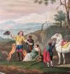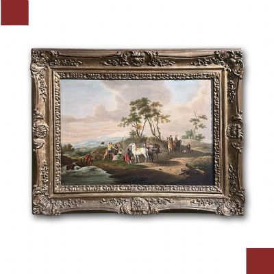 Grazioso dipinto ad olio su tavoletta di rovere, corredato da una cornice coeva in legno intagliato e dorato a pastiglia con foglia d’oro. L'opera raffigura una scena campestre animata, dove si intravedono figure a riposo lungo un fiume. Tra i personaggi si notano cavalieri e cani da caccia, mentre una donna è seduta accanto a un uomo in piedi che si sta togliendo il cappello. Il paesaggio, di gusto romantico, si distingue per la buona resa pittorica e stilistica. Il dipinto si presenta in buone condizioni conservative, con minimi interventi di restauro. Si tratta di un’opera di pregevole fattura, capace di arricchire con gusto e raffinatezza qualsiasi ambiente. Manifattura attribuibile alla scuola inglese dei primi del XIX secolo (1820 ca.).