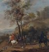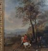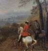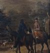 Bel dipinto realizzato ad olio su tela, in prima tela, ed incorniciato da una cornice in legno intagliato e dorato a foglia d’oro. La scena raffigurata rappresenta una partenza di caccia, con figure di cacciatori a cavallo in primo piano e in lontananza, circondati da cani pronti alla caccia. L’ambiente è collinare, e sullo sfondo si intravede un paesaggio naturale che arricchisce la composizione. L’opera si distingue per l’elevata qualità stilistica e pittorica, evidenziando un sapiente uso dei colori, delle ombreggiature e delle sfumature che conferiscono profondità e realismo alla scena. Manifattura ascrivibile alla Scuola Inglese della metà del XVIII secolo.