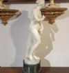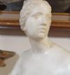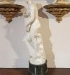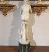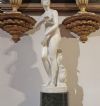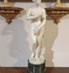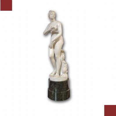 Bellissima riproduzione in piccola scala della Venere Medicea, scolpita in marmo bianco statuario di Carrara con base cilindrica in marmo verde di Prato. La statua riprende la celebre Venere dei Medici, conservata oggi alle Gallerie degli Uffizi, che raffigura la dea in versione “pudica”, poiché colta nell’atto di coprirsi istintivamente il seno e il pube, come se si fosse accorta di essere scrutata da uno sguardo indiscreto. Il modello si ispira all’Afrodite Cnidia, realizzata da Prassitele nella metà del IV secolo a.C., che conobbe grande fortuna in epoca ellenistica e romana, venendo reinterpretata in numerose varianti. Si tratta di una statua di grande bellezza e pregio, in ottime condizioni, apprezzabile per la resa stilistica dei dettagli e delle forme, capace di arredare con un tocco di antichità ed eleganza qualsiasi ambiente. Manifattura fiorentina del periodo neoclassico, intorno alla fine del XVIII secolo.