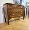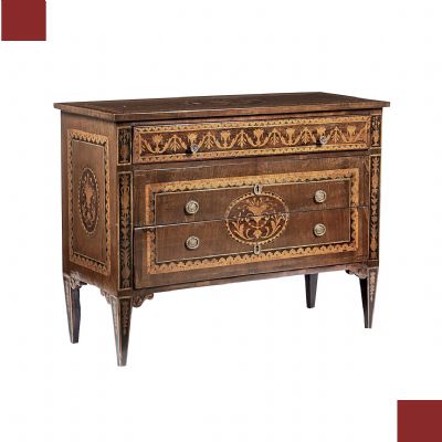 Suntuoso cassettone lastronato in legno di noce, impreziosito da intarsi in legno di frutto e pastiglia, tecnica tipica della scuola ebanista lombarda. Il cassettone presenta gambe troncopiramidali, caratteristiche del periodo, e una forma lineare ed elegante. Dispone di tre cassetti, di cui uno più piccolo posizionato sotto il piano, e due cassetti più grandi e ergonomici ideali per riporre oggetti, aperti mediante tiranti in bronzo. La grande raffinatezza di questo cassettone risiede nella sua decorazione ad intarsio, molto ricca e dettagliata, che si estende sul fronte, sulle gambe, sui lati e sul piano, presentando motivi geometrici e fitomorfi. Si tratta di un mobile di grande gusto e qualità, in grado di arredare con classe e raffinatezza qualsiasi ambiente. Manifattura lombarda (Lombardia, Italia), probabilmente ascrivibile alla scuola dell’ebanista Giuseppe Maggiolini, del periodo neoclassico, intorno alla fine del XVIII secolo.
