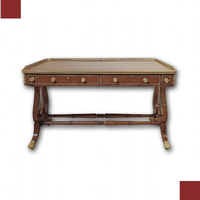 Bellissimo ed elegante scrittoio da centro, con lastronatura di alta qualità in legni di noce e palissandro, ed impreziosito da decorazioni in bronzo fuso a cera persa. Lo scrittoio si distingue per le sue gambe a lira, unite da parti tornite e decorate con dettagli floreali in bronzo dorato, con gambe che terminano in zampe ferine anch’esse in bronzo dorato, dotate di rotelle utili per facilitare lo spostamento. Il piano presenta una fascia ad intarsio ed una balaustra anch’essa in bronzo dorato, finemente cesellata, che conferiscono ulteriore eleganza. Nella fascia del sottopiano si trovano tre cassetti apribili con maniglie in bronzo dorato: due di medie dimensioni e uno particolare più piccolo, posizionato vicino all’angolo di destra, funzionale per penne e calamai. Si tratta di uno scrittoio di grande gusto e raffinatezza, capace di arredare con classe ed eleganza qualsiasi ambiente. Manifattura italiana, che richiama lo stile neoclassico degli ebanisti francesi, nel periodo Napoleone III, intorno alla metà del XIX secolo.