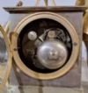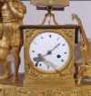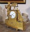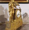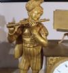 Raffinato orologio in bronzo dorato, con splendida doratura. L’oggetto presenta decori classici, tipici del periodo, con festoni e strumenti musicali. Nella parte superiore, infatti, è presente una chitarra poggiata su uno sgabello da musicista a destra, mentre a sinistra si trova un giovane in piedi, intento a suonare il flauto. Sopra il quadrante, inoltre, è raffigurato uno spartito su cui si legge: “Air des Visitandines”, famoso brano della fine del XVIII secolo, generalmente accompagnato dalla chitarra. Il quadrante è caratterizzato da numeri romani e dispone di una chiave per impostare le sveglie. Il meccanismo, a sospensione a filo, è di epoca e funzionante, e la suoneria riproduce il suono delle ore e delle mezze ore. Si tratta di un orologio di grande gusto e raffinatezza, in grado di arredare con eleganza e classe qualsiasi ambiente. Manifattura francese della fine del XVIII secolo.