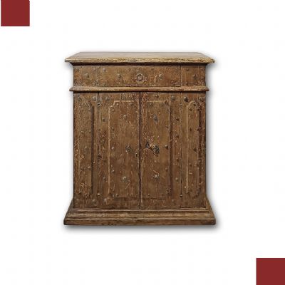 Raffinata piccola credenza in legno massello di abete, intagliata e dipinta a finto legno, che richiama le tecniche ebaniste bolognesi. Il mobile presenta un design lineare, con piedi a balaustra, e si caratterizza per due sportelli e un cassetto ergonomici, ideali per riporre oggetti. La sua particolare eleganza e raffinatezza risiedono nella decorazione pittorica presente sul fronte e sui lati, decorata con finti bulloni e bugnature, che rendono questo mobile davvero squisito. Si tratta di una credenza di grande gusto e raffinatezza, capace di arredare con un tocco di classe e antichità qualsiasi ambiente. Manifattura Emiliana (Emilia-Romagna, Italia) degli inizi del XVIII secolo.