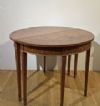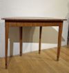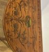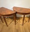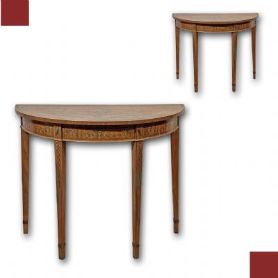 Raffinata e suntuosa coppia di consolle in legno di acero finemente intagliato. Le consolle presentano una forma a mezzaluna, con gambe dritte e troncopiramidali. La loro eleganza è esaltata dalle decorazioni dipinte ad olio direttamente sul legno, sia sul piano che sul sottopiano, raffiguranti motivi floreali a ghirlande e intrecci, oltre a due paesaggi di gusto classico dipinti all’interno di due riquadri sul piano. Grazie alla loro forma, è possibile unirle per creare un tavolino rotondo, poiché l’altezza è ideale per questa funzione. Si tratta di due consolle di grande stile e raffinatezza, capaci di arredare qualsiasi ambiente con un tocco di classe e di antichità. Manifattura tipica inglese della prima metà del XIX secolo.
