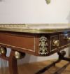 Bellissimo ed elegante scrittoio da centro, con lastronatura di alta qualità in legni di noce e palissandro, ed impreziosito da decorazioni in bronzo fuso a cera persa. Lo scrittoio si distingue per le sue gambe a lira, unite da parti tornite e decorate con dettagli floreali in bronzo dorato, con gambe che terminano in zampe ferine anch’esse in bronzo dorato, dotate di rotelle utili per facilitare lo spostamento. Il piano presenta una fascia ad intarsio ed una balaustra anch’essa in bronzo dorato, finemente cesellata, che conferiscono ulteriore eleganza. Nella fascia del sottopiano si trovano tre cassetti apribili con maniglie in bronzo dorato: due di medie dimensioni e uno particolare più piccolo, posizionato vicino all’angolo di destra, funzionale per penne e calamai. Si tratta di uno scrittoio di grande gusto e raffinatezza, capace di arredare con classe ed eleganza qualsiasi ambiente. Manifattura italiana, che richiama lo stile neoclassico degli ebanisti francesi, nel periodo Napoleone III, intorno alla metà del XIX secolo.
