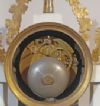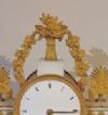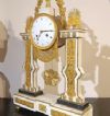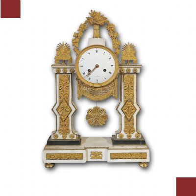 Raffinato orologio a tempietto, realizzato in marmo bianco statuario di Carrara e decorato con bronzo dorato al mercurio. L’orologio presenta eleganti decorazioni in bronzo, caratterizzate da motivi geometrici e fitomorfi, arricchite da ghirlande di fiori e palmette ai lati delle colonne. Il pendolo è ornato da una classica raffigurazione con figura raggiata, mentre il quadrante, apribile, indica le ore in numeri romani e reca l’iscrizione “Paris”, che ne testimonia la provenienza dall’orologiaio. Il meccanismo, con sospensione a filo di seta, è dotato di suoneria che segnala le ore e le mezze ore. Si tratta di un orologio di grande gusto e raffinatezza, capace di arredare con classe qualsiasi ambiente. Manifattura francese del periodo Direttorio, intorno alla fine del XVIII secolo.