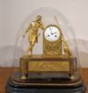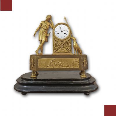 Raffinato orologio in bronzo dorato, montato su una base in legno ebanizzato e dotato di campana in vetro a protezione. L’orologio è decorato da una figura statuaria posta sulla sinistra, identificabile come Adone, l’amante della dea Venere, con gli attributi tipici da cacciatore; anche sulla destra sono raffigurati un cane da caccia e una lancia. Inoltre, alla base dell’orologio è rappresentata una scena di chiaro richiamo classico, in cui si riconoscono Adone disteso e probabilmente la dea della caccia, Diana, che lo sveglia con in mano un arco. Il quadrante dell’orologio è decorato con motivi di trionfo e presenta numeri romani. Il meccanismo, originale dell’epoca, è a sospensione a filo di seta, e la suoneria riproduce il suono delle ore e delle mezze ore; la macchina è integra e attualmente in fase di revisione. Si tratta di un orologio di grande classe ed eleganza, in grado di aggiungere un tocco di raffinatezza e antichità all’arredamento di qualsiasi ambiente. Manifattura francese del periodo neoclassico, intorno alla fine del XVIII secolo.