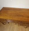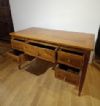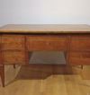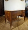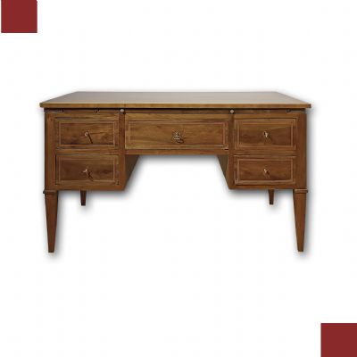 Raffinato scrittoio in legno massello e lastronatura di noce. Lo scrittoio è decorato con intarsi sui lati, sul fronte e sul piano, con motivi geometrici realizzati in legno di noce e ciliegio, che donano ulteriore eleganza. È inoltre caratterizzato da cinque cassetti sul fronte, di cui quello centrale più ampio, progettati ergonomicamente per riporre oggetti. Il mobile presenta sotto il piano un ripiano scorrevole rivestito in pelle rossa dell’epoca, e la sua particolarità risiede nello scorrimento anche del piano principale, che consente di lavorare sullo scrittoio senza dover porre le gambe al di sotto, creando così più spazio per il lavoro. Lo scrittoio è inoltre a giorno, con retro a finti cassetti e serrature, rendendolo adatto anche ad essere collocato al centro della stanza. Si tratta di un mobile di grande gusto e raffinatezza, in grado di arredare con classe ed eleganza qualsiasi ambiente. Manifattura toscana del periodo Luigi XVI, intorno alla seconda metà del XVIII secolo.