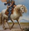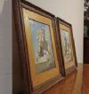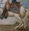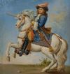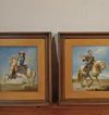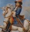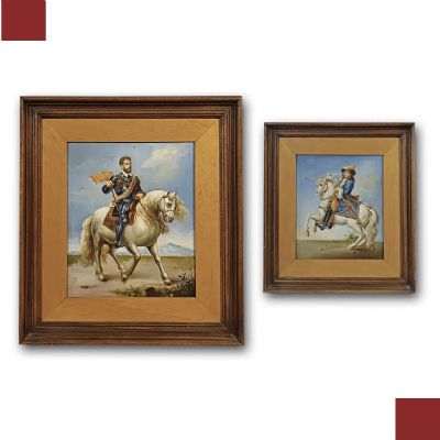 Raffinata coppia di dipinti ad olio su tavoletta lignea, corredati da cornice in legno intagliato e passpartout anch’esso in legno. Nei dipinti sono rappresentati due personaggi, entrambi su un cavallo bianco. Il primo, con il cavallo alzato sulle zampe anteriori, riprende il dipinto del Re Sole, un giovane Luigi XIV, di cui si apprezzano la ricchezza degli abiti, delle briglie e del cappello. Nell’altro dipinto, invece, l’opera si ispira al ritratto di Carlo V, imperatore del Sacro Romano Impero, il quale indossa una cotta di maglia e presenta un portamento più austero. Si tratta di una coppia di dipinti di grande gusto e raffinatezza, capaci di donare un tocco di classe e antichità a qualsiasi ambiente. Manifattura italiana della prima metà del XIX secolo.