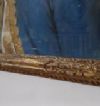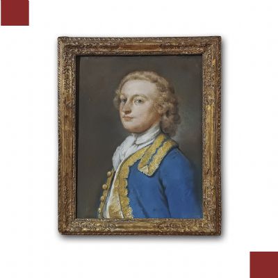 Raffinato ritratto realizzato a pastello su tela, inserito in una cornice di legno intagliato e dorato, protetta da vetro. Nel dipinto è raffigurato il volto di un gentiluomo, a mezzo busto, vestito con abiti d’epoca. L’uomo è rappresentato con il volto di tre quarti, con capelli biondi e mossi, occhi azzurri e labbra sottili ma carnose. Indossa un fazzoletto che gli adorna il collo e una giacca blu impreziosita da dettagli dorati, che ne esaltano l’eleganza. Si tratta di un’opera in cui si apprezza la resa stilistica e fisiognomica dei dettagli; di grande gusto e raffinatezza, questo quadro è in grado di donare un tocco di classe all’arredamento di qualsiasi ambiente. Manifattura francese del periodo neoclassico, intorno alla fine del XVIII secolo.