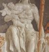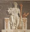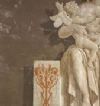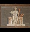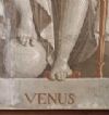 Meraviglioso papier peint dipinto a tempera magra su carta, applicato su tela, con cornice in legno intagliato, dipinto a tempera magra e pastiglia dorata. Il papier peint rappresenta Venere come se fosse una statua seduta su un trono marmoreo. Sul trono, spicca l'iscrizione “Venus”. Con una mano, la dea tiene in collo il figlio Cupido, caratterizzato dalle ali, mentre con l'altra solleva una torciera, animata da una fiamma rossa. Tra i delicati dettagli dell'opera, si possono osservare una coppia di uccelli intenti a dissetarsi da un “kantharos” e i fregi del trono, adornati con motivi animali e floreali. Venere è ritratta in tutta la sua maestosità e regalità, con il seno scoperto e avvolta in pochi lembi di chitone. Le figure si stagliano in un elegante sfondo grigio antracite, conferendo all'opera un'atmosfera quasi simbolica. La rappresentazione è caratterizzata da una grande maestria artistica, rendendola incredibilmente raffinata. Si ascrive ad artista anonimo francese del periodo neoclassico, intorno alla seconda metà del XVIII secolo.