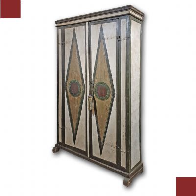 Raffinato stipo in legno massello di castagno, intagliato e dipinto a tempera magra, privo di sottofondo gessoso. Lo stipo si distingue per piedi lineari, una terminazione superiore a modanature e due ante. Di queste, una è apribile mediante chiave e serratura, mentre l’altra è dotata di serratura interna ad incastro; entrambe si aprono su quattro ripiani ergonomici ideali per riporre oggetti. La decorazione pittorica del mobile è di grande raffinatezza e in parte ridipinta, presente sia sul fronte che sui lati, e si caratterizza per motivi geometrici, lineari e a rombi, nei colori del bianco, giallo, verde e rosso. Si tratta di un mobile di grande gusto ed eleganza, capace di donare un tocco di classe e di antichità a qualsiasi ambiente. Manifattura Toscana-umbra (centro-Italia), intorno agli inizi del XVIII secolo.